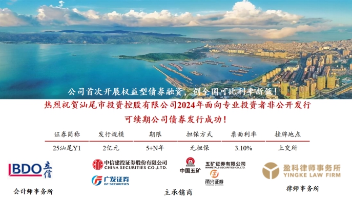 創(chuàng)新開拓權(quán)益型融資,票面利率再創(chuàng)新低!熱烈祝賀汕尾市投資控股有限公司2025年非公開可續(xù)期公司債券成功發(fā)行!