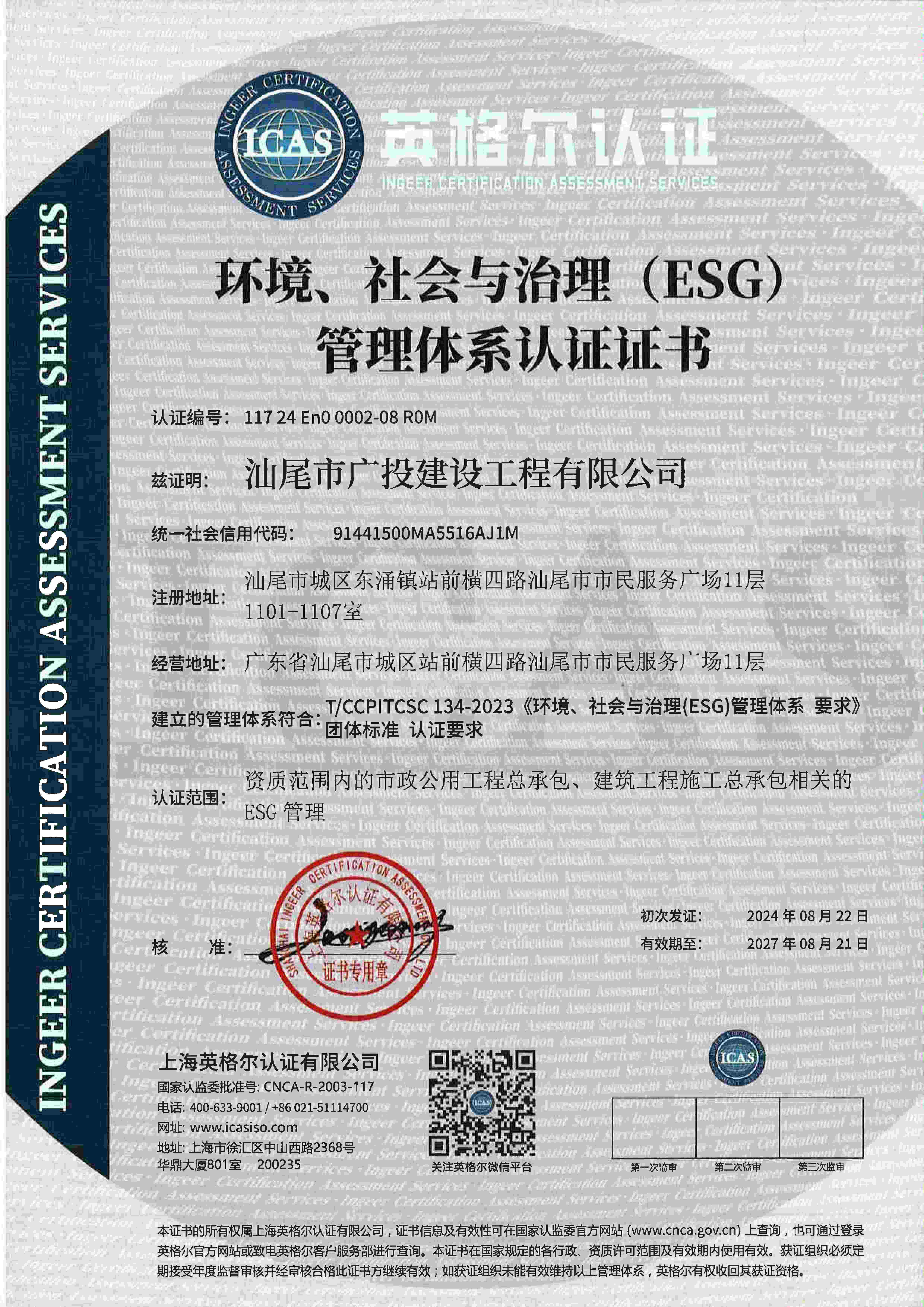 為推進企業(yè)綠色發(fā)展,實現“雙碳”目標,汕尾市廣投建設工程有限公司(以下簡稱“汕尾廣投公司”)率先引入ESG管理體系,于近日榮獲中國基建行業(yè)首個ESG管理體系認證。 ESG體系強調綠色低碳發(fā)展、社會責任、員工權益和公司治理等方面,引入該體系建設可從整體上持續(xù)優(yōu)化管理模式。通過全要素成體系推進,8月22日汕尾廣投公司榮獲由ICAS英格爾認證頒發(fā)的中國基建行業(yè)首張ESG管理體系認證證書,成為國內基建領域推行ESG管理的先行者。同時,汕尾廣投公司榮獲ESG管理體系認證是整個基建行業(yè)綠色轉型的一個重要里程碑,為推動行業(yè)向綠色低碳轉型提供了新樣本。 汕尾廣投公司成立以來,堅持“創(chuàng)新、協(xié)調、綠色、開放、共享”的發(fā)展理念,承接了多個重點民生項目和應急工程,已成長為區(qū)域基建領域的骨干力量。接下來,汕尾廣投公司將繼續(xù)發(fā)揮國企優(yōu)勢和擔當,利用高新技術企業(yè)成功創(chuàng)建優(yōu)勢,進一步推進綠色建筑和低碳技術的研發(fā)應用,充分釋放ESG體系治理效能,為實現公司高質量發(fā)展,落實省市《碳達峰實施方案》,助力區(qū)域基建行業(yè)綠色低碳轉型貢獻力量。
